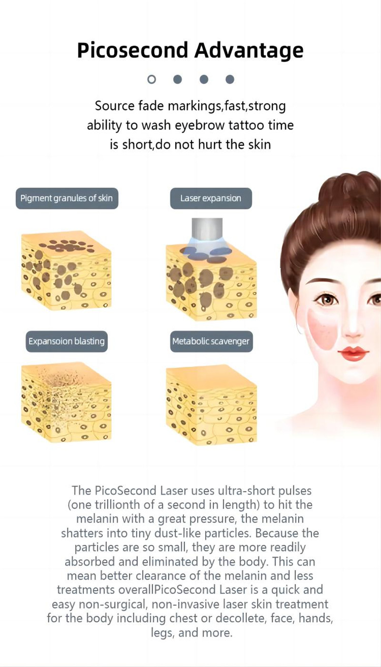 The PicoSecond Laser uses ultra-short pulses (one trillionth of a second in length) to hit the melanin with a great pressure, the melanin shatters into tiny dust-like particles. Because the