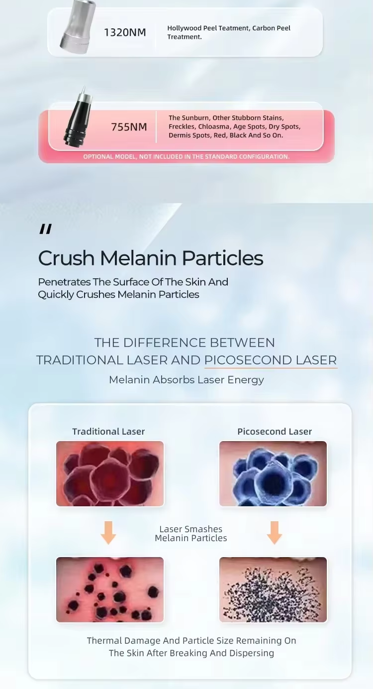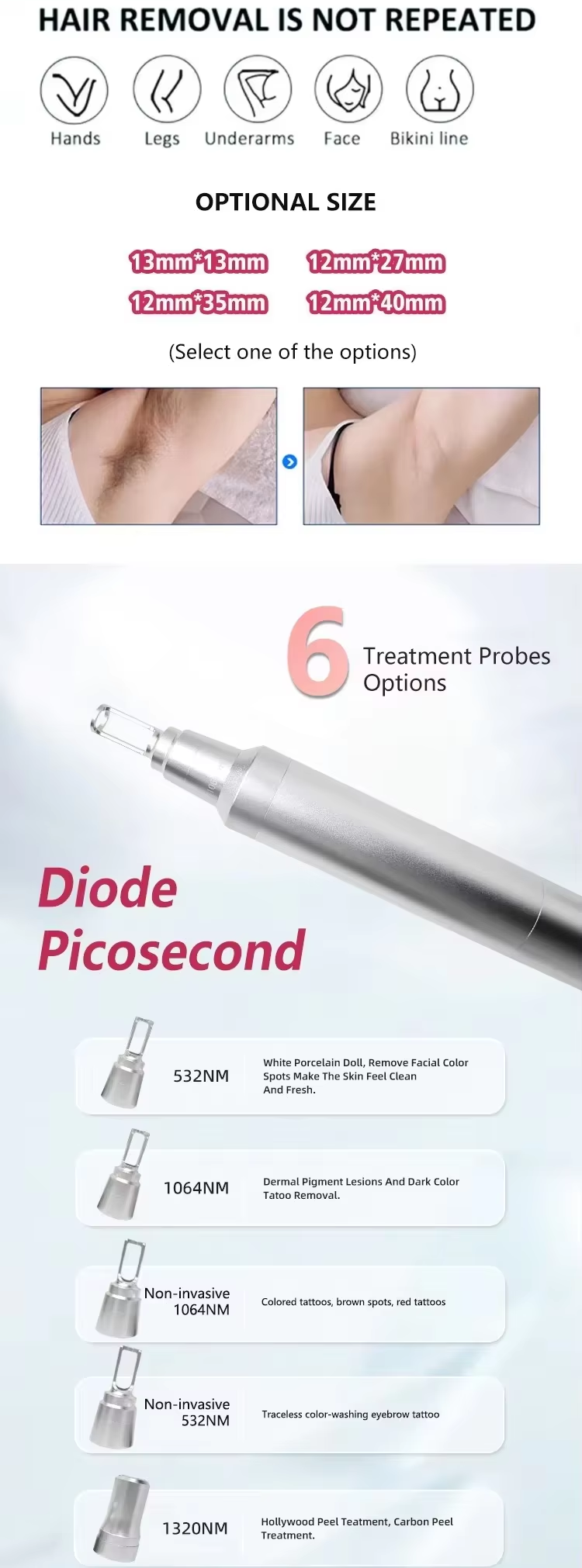 Wavelength: 755nm+808nm+1064nm Pico Tips: 5 Display: 15.6-inch touch screen Maximum output power: 2500W Warranty: 1 year