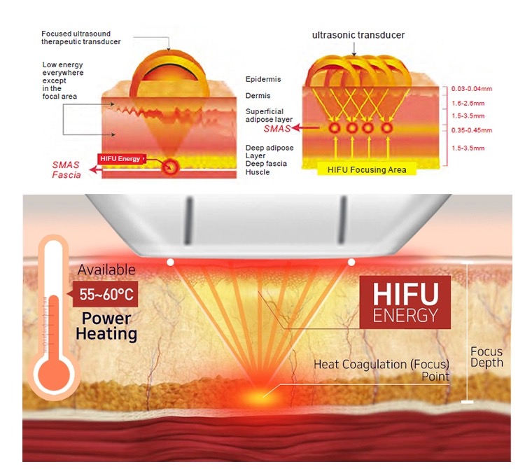 2. With a special transmitter transmission from the skin surface conduction of high-energy focused ultrasound to the SMAS layer;