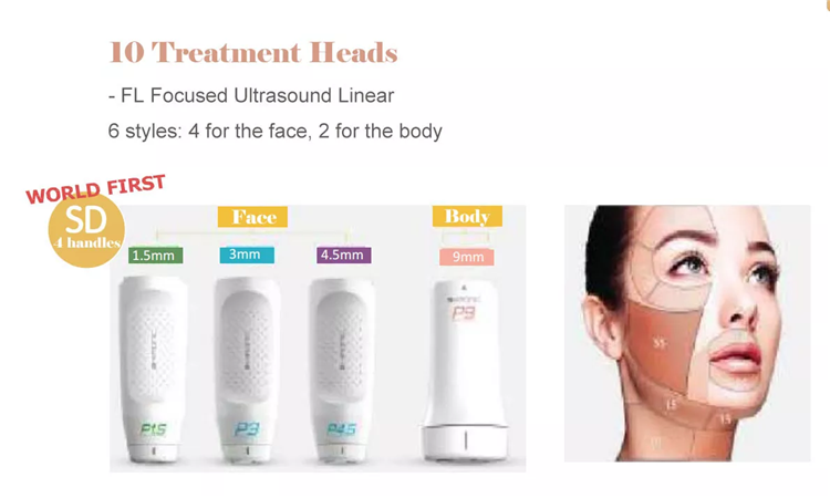 MFU lifting equipment can penetrate through 1.5mm, 3mm, 4.5mm deep into the skin, which means that the thermal energy can be transmitted to the SMAS layer, one of the main causes of skin sagging.