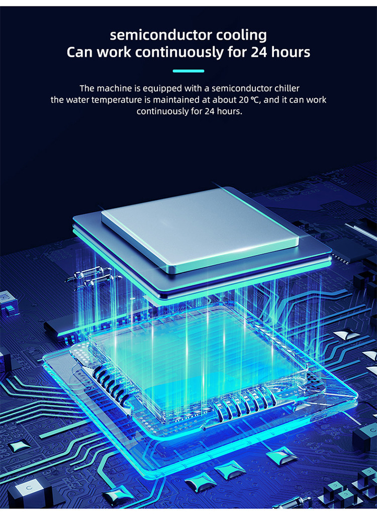 The machine is equipped with a semiconductor chiller the water temperature is maintained at about 20 ℃, and it can work continuously for 24 hours.