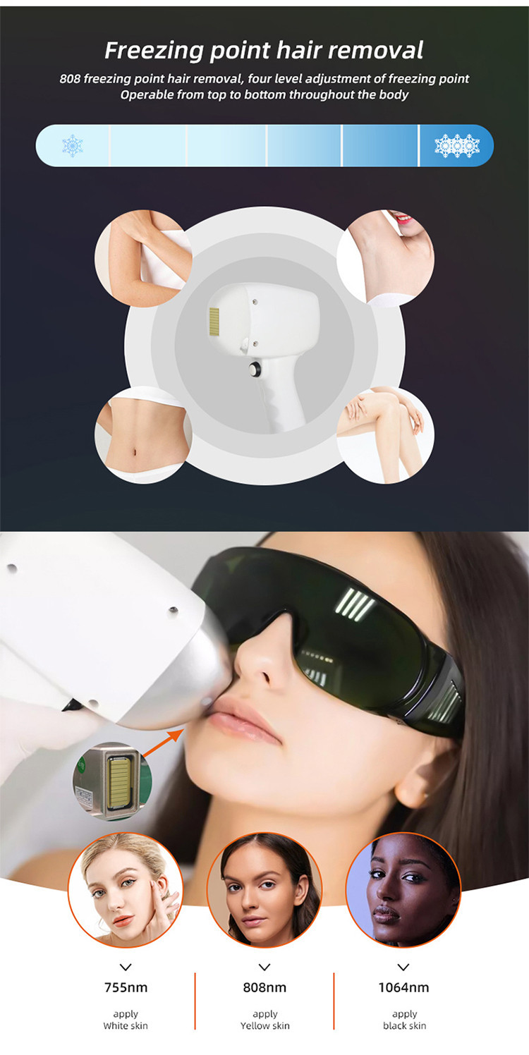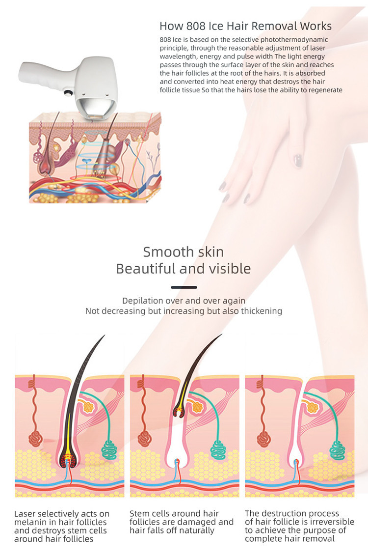 808 Ice is based on the selective photothermodynamic principle, through the reasonable adjustment of laser wavelength, energy and pulse width The light energy passes through the surface layer of the skin and reaches the hair follicles at the root of the hairs. It is absorbed and converted into heat energy that destroys the hair follicle tissue So that the hairs lose the ability to regenerate.