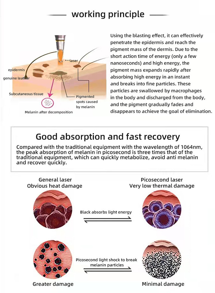 Compared with the traditional equipment with the wavelength of 1064nm, the peak absorption of melanin in picosecond is three times that of the traditional equipment, which can quickly metabolize, avoid anti melanin and recover quickly.